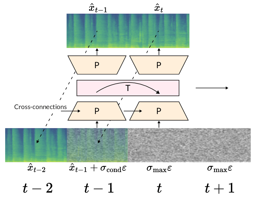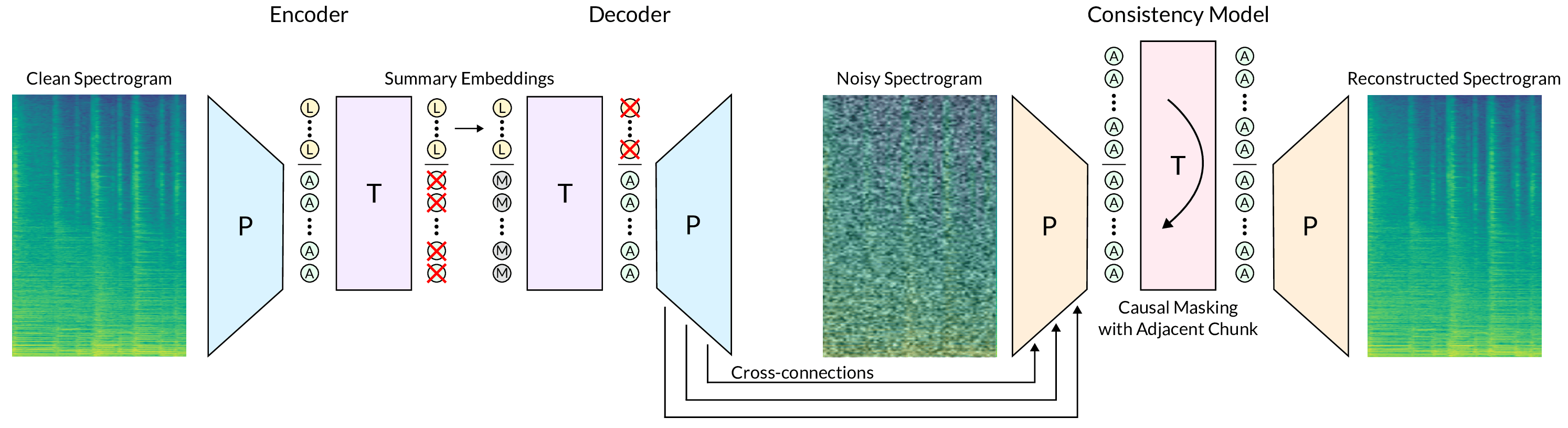 Convolutional patchifiers and de-patchifiers are indicated with P, transformer modules with T. Audio embeddings are illustrated as A, learned/summary embeddings as L, and mask embeddings as M. We represent chunked causal masking with a curved arrow.